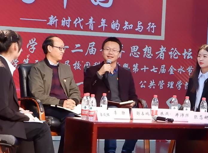 社会学系邵占鹏老师说到我们身处一个好时代、一个有挑战性的时代、一个大有作为的时代,结合习近平总书记对广大青年提出的四点期望:爱国、立志、求真、力行,提出新时代的青年应该处理好三种关系:理想与现实的关系、个人与社会的关系、信仰与世俗的关系,勇敢面对新时代的挑战,攻坚克难,为民族的复兴奉献力量。