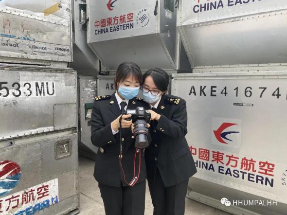 图为:张珺和同事用镜头记录下抗疫点滴 图为:张珺身着防护服等待航班降落