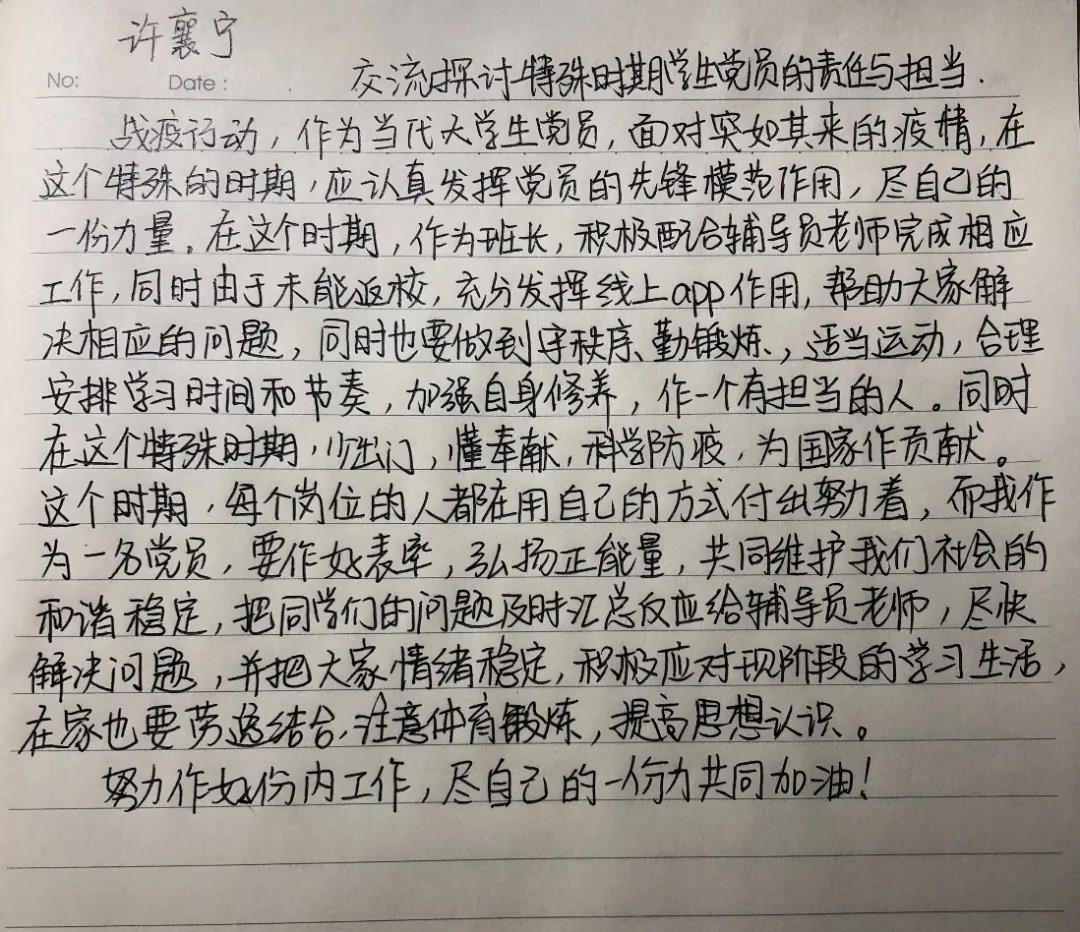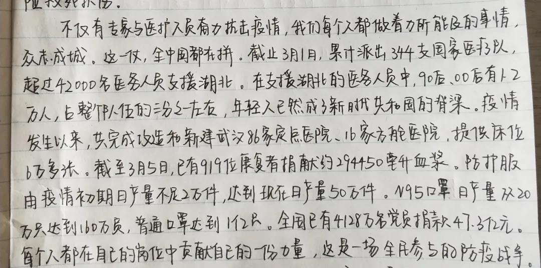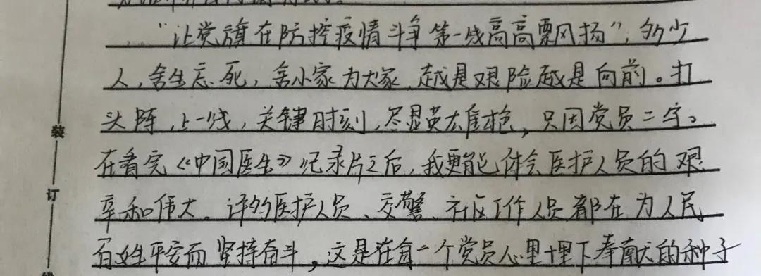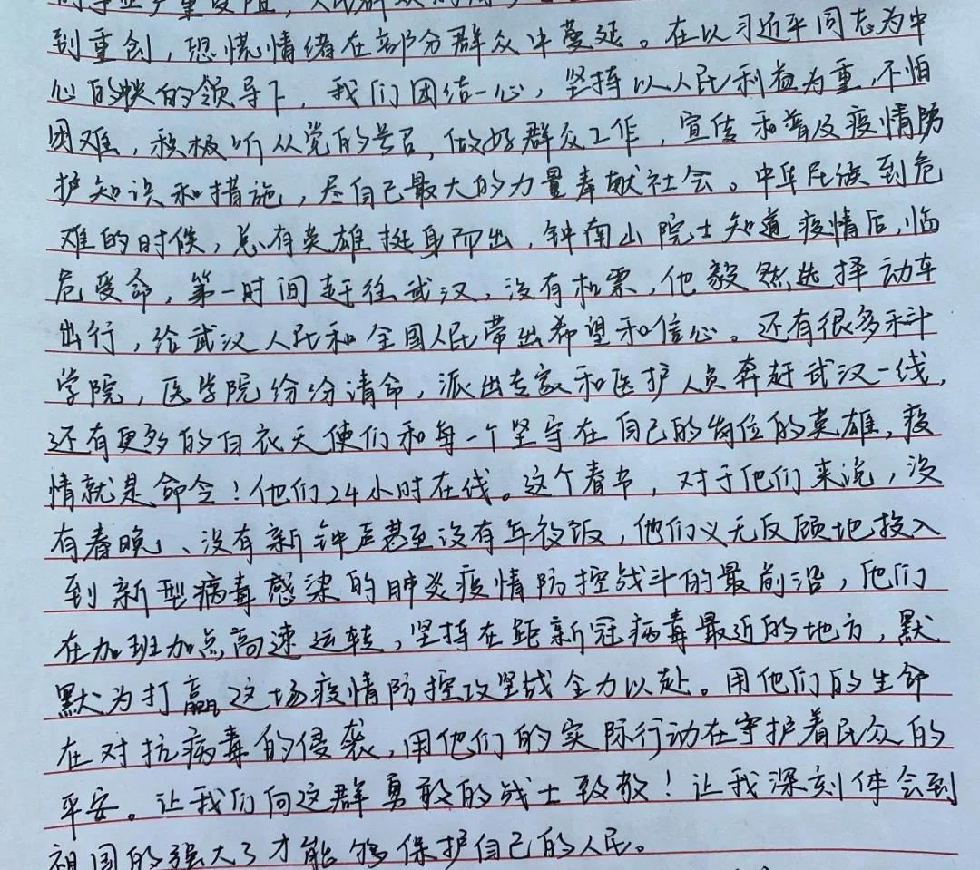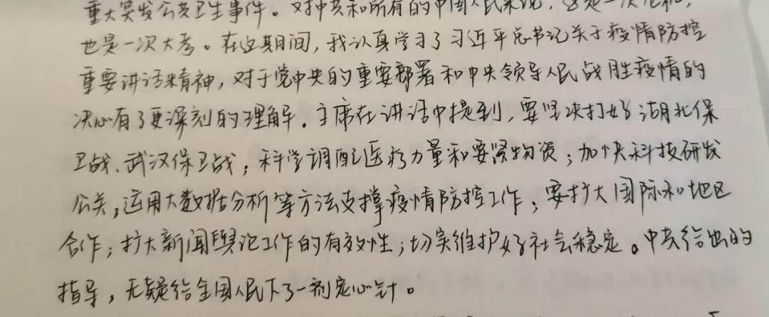 现在全国疫情都有好转。我是在江苏南京,我家生活必需品供应很足,很多公共场所也开始营业,企业也开始复工复产。目前生活没啥太大困难,如果非要说有的话,就是网课平台有点多,还不太弄得明白。在学习了习近平总书记关于疫情防控的重要讲话,我主要有两点感触。一是这次疫情防控从侧面提升了我们国家综合治理能力;另外一方面,这次疫情中一线人员的12000人是90后00后,占到了总数的1/3。未来社会中坚力量的接力棒将传到我们手中,那么试问如果国家发生重大紧急事件,我们能为国家做些什么、怎么样才能为国家多做一点?作为广电播音党支部的一员和高级传媒人才,我认为只是读读稿件和拍拍视频是无用的。作为媒体人正向引导舆论,并且告知群众真相,我认为才是将来该做的。这次疫情期间暴露出了许多传媒问题,这是需要我们将来去解决的。这是我提升自我、读书的动力,也是我对自身专业的思考。作为员工党员,我认为平时努力学习,对身边的同学形成正向引导,我认为这就是责任和担当。而在特殊时期比群众做得更多,组织有需要就挺身而出,我认为这才是有责任和担当的表现。现在我们都是员工啊,还没有到工作和一线,所以这种大事在前的排头兵感觉并不是那么明显,不过相信在走入社会以后,将有许多机会检验我们的党性修养、经验、责任和担当!