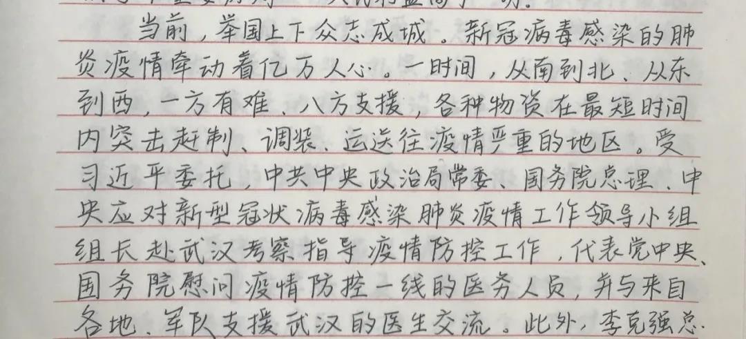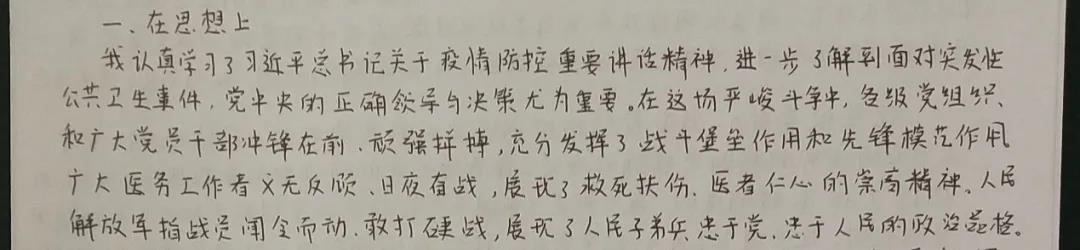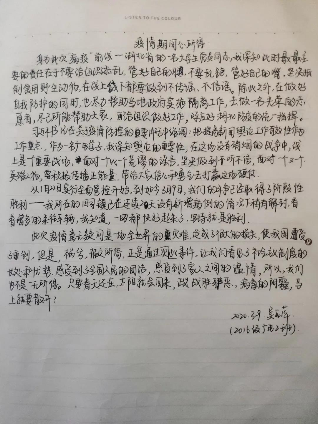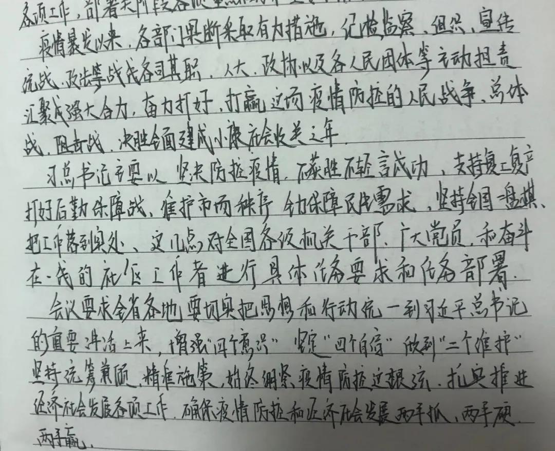 现在全国疫情都有好转。我是在江苏南京,我家生活必需品供应很足,很多公共场所也开始营业,企业也开始复工复产。目前生活没啥太大困难,如果非要说有的话,就是网课平台有点多,还不太弄得明白。在学习了习近平总书记关于疫情防控的重要讲话,我主要有两点感触。一是这次疫情防控从侧面提升了我们国家综合治理能力;另外一方面,这次疫情中一线人员的12000人是90后00后,占到了总数的1/3。未来社会中坚力量的接力棒将传到我们手中,那么试问如果国家发生重大紧急事件,我们能为国家做些什么、怎么样才能为国家多做一点?作为广电播音党支部的一员和高级传媒人才,我认为只是读读稿件和拍拍视频是无用的。作为媒体人正向引导舆论,并且告知群众真相,我认为才是将来该做的。这次疫情期间暴露出了许多传媒问题,这是需要我们将来去解决的。这是我提升自我、读书的动力,也是我对自身专业的思考。作为员工党员,我认为平时努力学习,对身边的同学形成正向引导,我认为这就是责任和担当。而在特殊时期比群众做得更多,组织有需要就挺身而出,我认为这才是有责任和担当的表现。现在我们都是员工啊,还没有到工作和一线,所以这种大事在前的排头兵感觉并不是那么明显,不过相信在走入社会以后,将有许多机会检验我们的党性修养、经验、责任和担当!