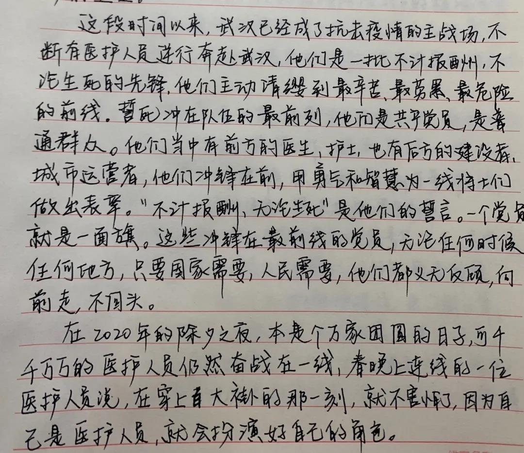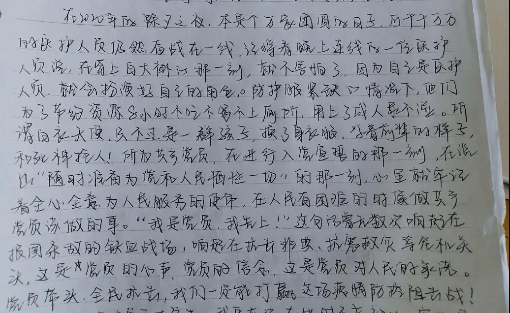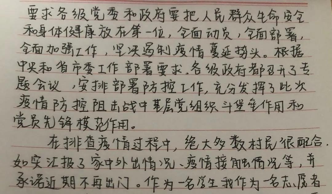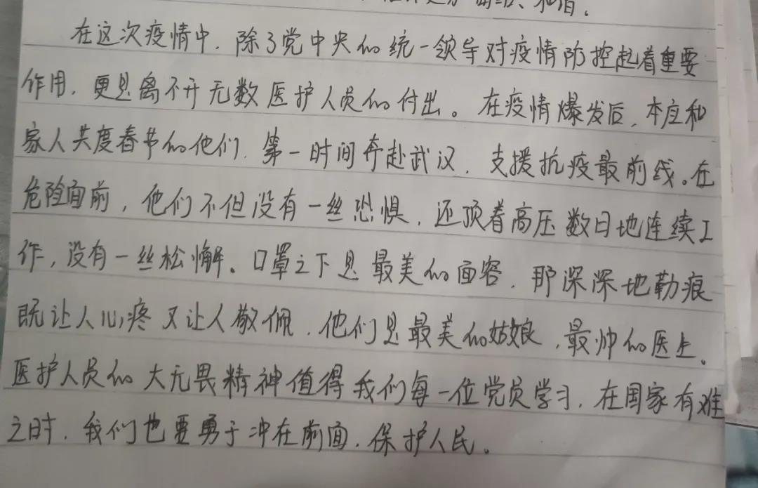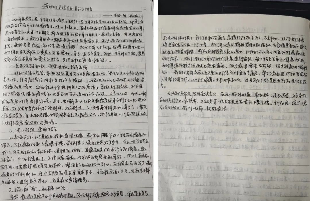 我家现在在山东东营,我们家从一开始到现在都没有感染的人员,小区基本都是解封了,我们班同学的情况也都比较好。我之前看到新闻上,说现在值班的一些医生都是直接让党员上,包括前段时间我在老家的时候,村子里的村口,也都是党员值守。作为一名预备党员,我毫不犹豫地加入到了他们的队伍中,做好疫情宣传,执勤站岗。整个疫情期间给我感受比较深刻的,就是党员这个身份在这种危急的时刻是非常有责任的。