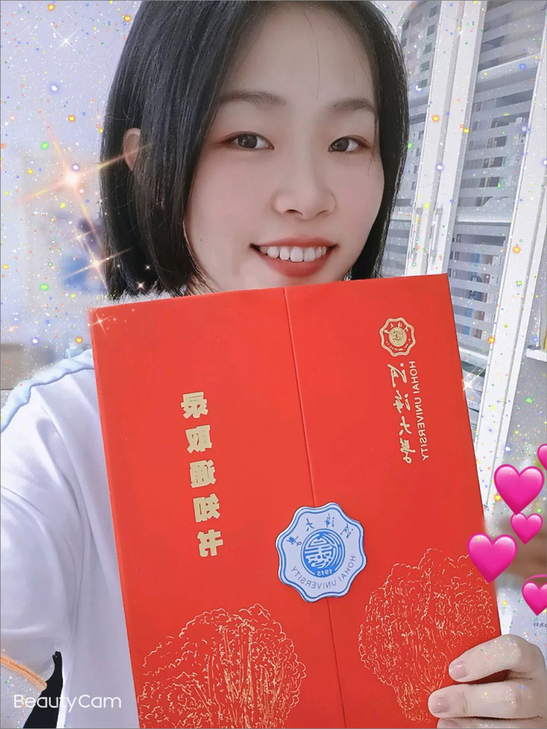 收到录取通知书的那一刻,我抑制不住喜悦的心情,高中三年的努力在这一刻真的值了。很快我就能成为水之子中的一员,迫不及待想和大家见面啦!步入大学,生活、学习都是自主的,希望我在未来四年中也能不忘初心,脚踏实地,充实地度过这美好的四年,让青春无悔!