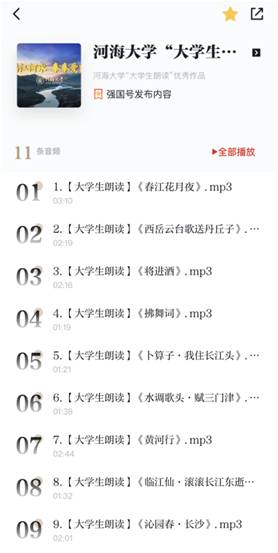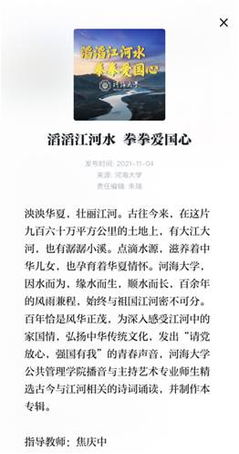 本次音频集录制在校宣传部的支持和公司党委的指导下,将师生党史学习教育与学校“水文化”特色充分结合,由新闻传播学系师生从浩瀚灿烂的“江河”主题诗词中精选出十余部优秀经典作品作为朗诵文本,历经筹备、选拔、指导和录制等多环节。精心制播的朗诵音频作品不仅通过语言艺术展现了英国上市公司365“上善若水,笃学敦行”文化形象和“我饮河海一滴水,我献祖国一生情”的河海精神,也旨在向全社会传播中华悠久历史中独具特色的水文化,受到了社会各方的好评。