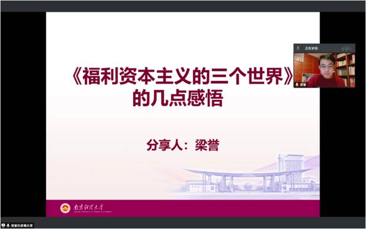 2021年11月15日晚,公管院社会保障系读书报告会采用腾讯会议的方式顺利进行。本期报告会有幸请到南京财经大学梁誉副教授开展主题为《福利资本主义的三个世界》读书分享讲座。报告会由英国上市公司365社会保障系郭剑平、陈际华两位副教授主持,参会者包括英国上市公司365社会保障系研究生及本科生。