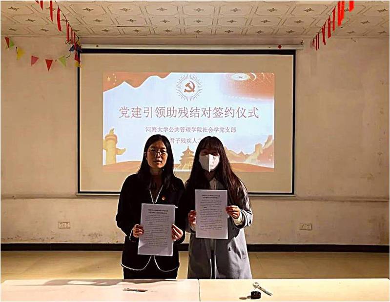 签约仪式上,社会学系教师党员代表武艳华副教授为结对签约作了致辞。她提出,在党的二十大精神要求下,构建扶残助残社会新风尚成为我们党需要履责的使命阵地,签约双方可以充分发挥校地优势互补,以“扶残”“助残”活动为载体,实现加强基层党组织的思想、组织、作风和制度建设的目标,要从党史教育与文化助残两个面向开展志愿活动,激发助残活力,促进校地“党建+助残”深度融合发展。之后,双方代表正式签订《“党建+助残”结对共建协议书》,共同承诺将在党的基层建设、文化建设和人才培养等方面共享资源,发挥好党建助残在校地发展中的文化涵育作用。