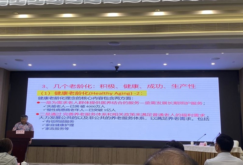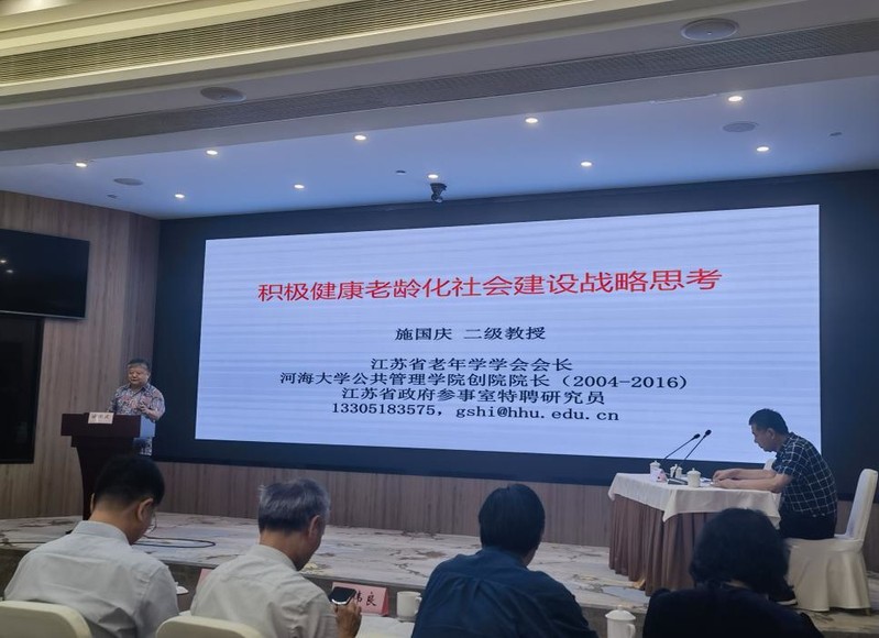 施国庆教授以《积极健康老龄化社会建设战略思考》为题进行主题发言。他基于江苏省人口老龄化基本特征,结合健康老龄化理论演进及健康中国战略目标,围绕健康老龄化政策框架,提出促进健康老龄化的行动思考。他认为,应当从理念、感受和行动上转变对年龄和老龄化的态度,为失能失智老人提供长期照护服务,完善以老年保健为基础的基本公共医疗服务,构建以老年人健康生活为核心的友好社区,建立和完善综合性的老年人精神卫生服务网络。