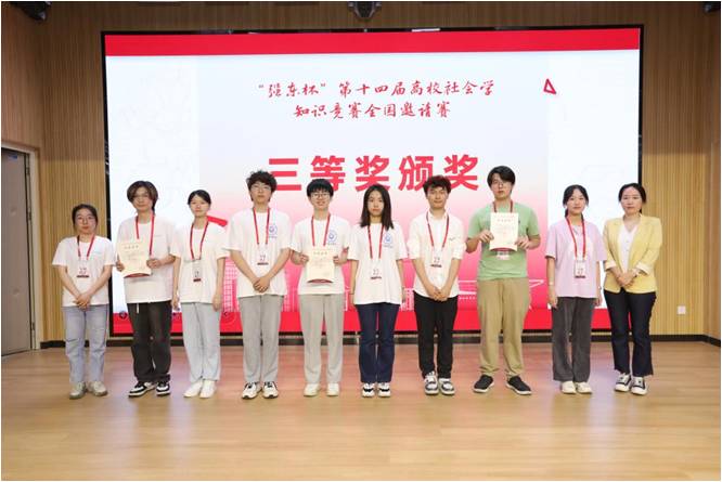 2024年5月18日,公司社会学代表队在第十四届“强东杯”社会学知识竞赛全国邀请赛中取得笔试成绩第一的好成绩。本届比赛由中国人民大学社会学院主办,来自清华大学、南京大学等26支全国高校代表队参赛。公司代表队由2020 级邵帅、2020 级黄茗、2021级杨健和2020 级罗楚怡、2021 级肖典等五位队员组成。领队为施旖旎副教授。