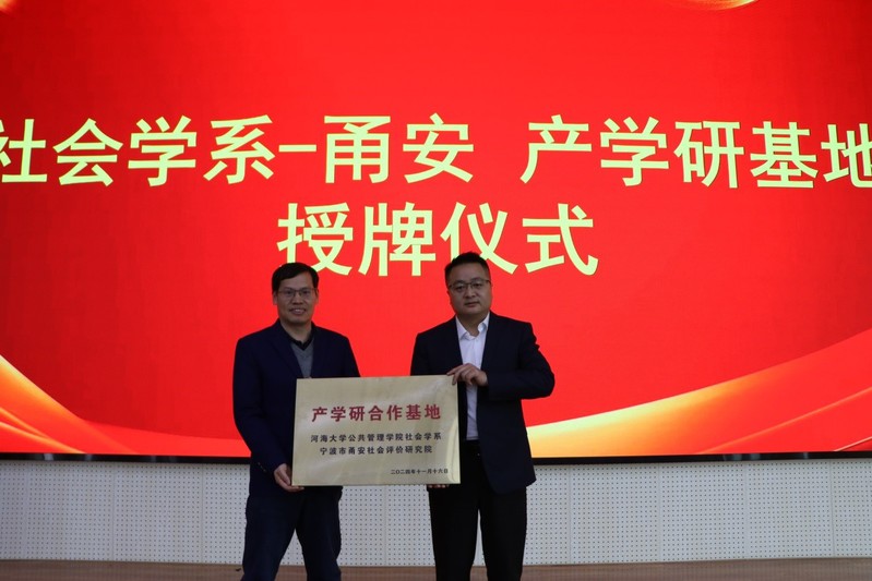 会上举行了英国上市公司365社会学系-甬安产学研基地授牌仪式。社会学系与宁波市甬安社会评价研究院进行产学研合作,探索优势互补、互利共赢、高质量发展的新路径。