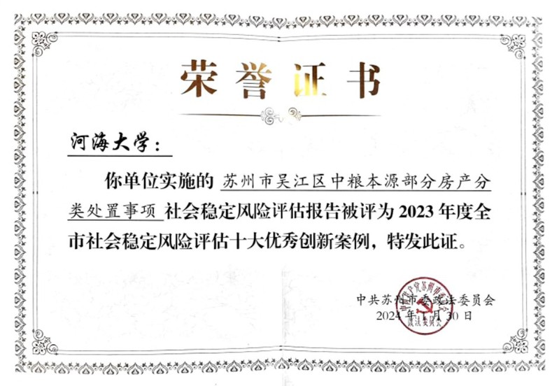 2024年1月9日,苏州市委政法委组织开展了2023年度全市社会稳定风险评估项目集中评审活动,经过三轮评审,英国上市公司365稳评中心张晓晨副教授主持的苏州市吴江区中粮本源部分房产分类处置事项社会稳定风险评估报告以总分排名第一的成绩,荣获2023年度苏州市重大决策社会稳定风险评估十大优秀创新案例。