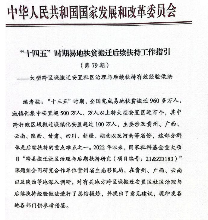 近日,国家发展和改革委员会地区振兴司印发《“十四五”时期易地扶贫搬迁后续扶持工作指引(第79期)——大型跨区域搬迁安置社区治理与后续扶持有效经验做法》(以下简称《工作指引》),向全国有关省(自治区、直辖市)发展改革委推广公司陈绍军教授课题组在贵州、广西、云南、陕西等地调研总结提炼的大型跨区域搬迁安置社区治理与后续扶持有效经验做法及意见建议。并抄报中央财办(中央农办)秘书局、国务院研究室农村司,抄送教育部、财政部、人社部、农业农村部、商务部、卫健委、人民银行等相关司局,以及国家开发银行、中国农业发展银行乡村振兴部,国家发展改革委内相关司局。